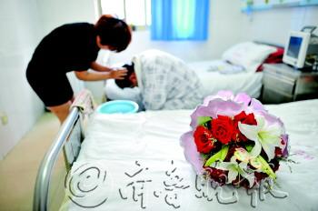 | 5月15日,我省首例H7N9禽流感患者张某的妻子给即将出院的丈夫洗头,床边放着一束友人送来的鲜花。 本报记者 陈文进 摄 |