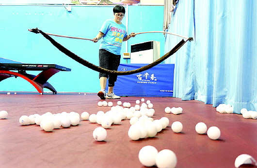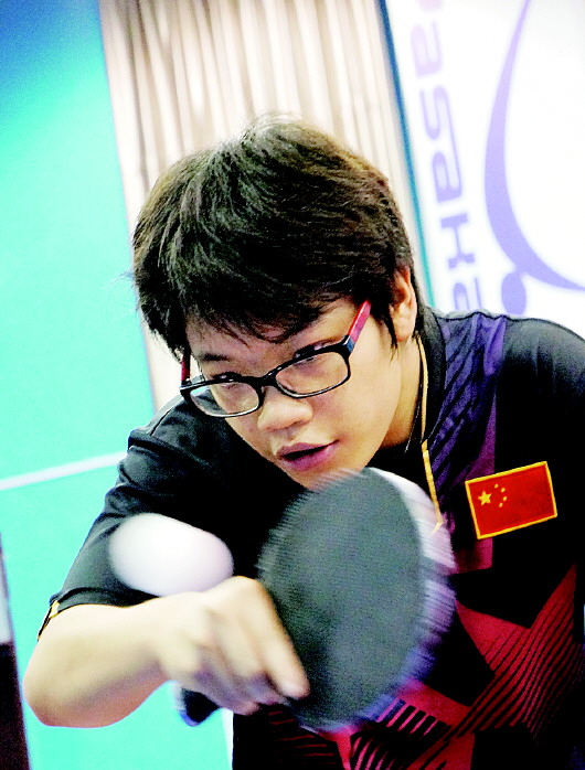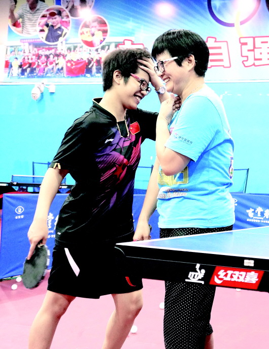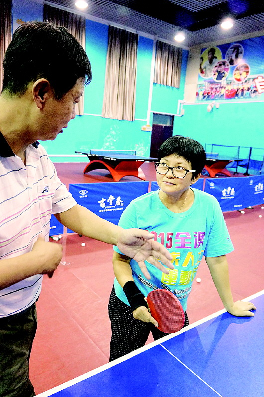 除了周日,两人每天都在馆内刻苦训练,基地有针对性地为她们找来经验丰富的教练员,一对一指导。经过一个时期的强化练习,两人的乒乓球技术进步飞快。阿敏比彩红年轻一些,今年23岁。阿敏小时候因脑瘫影响了上下肢的正常运动,属六级残障。大学毕业后,刚学打乒乓球的阿敏代表澳门在杭州参加了残运会,从此爱上了这项运动。去年亚运会上,阿敏一人拿了两块铜牌。这次经过两个月的训练,阿敏的球技和体能有明显提高。
