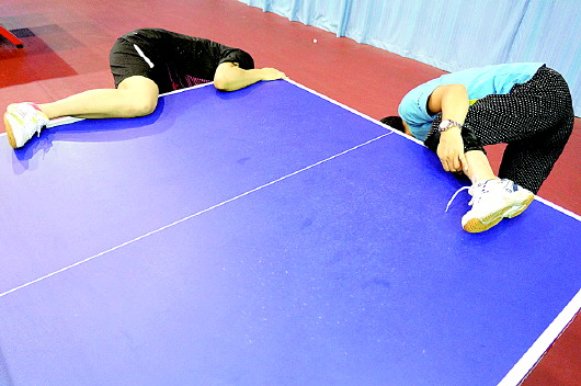 ◤两人每次训练结束后都要在球台上压压腿,舒缓一下紧张的肌肉。