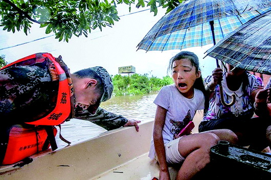 武警战士冒雨转移村民。一艘救生艇被树枝卡住,受灾小女孩受惊,救援官兵一边使尽全力推着救生艇,一边安慰小女孩。 图片来源:中国天气网
