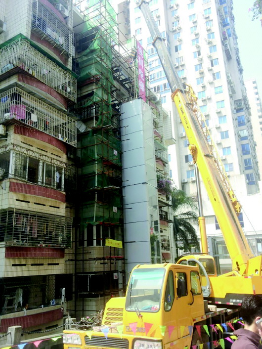 旧楼加装电梯成为不少老年人的需要。图为2014年9月,厦门一旧楼加装电梯的施工现场。 (资料片)