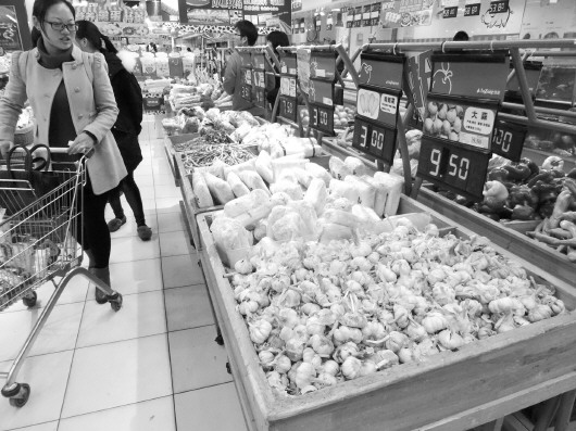超市内的大蒜价格高达9.5元每斤。 本报记者 左庆 摄