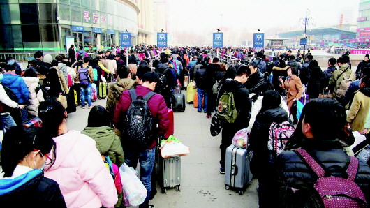 11日,各大高校相继放假,导致济南火车站旅客数量大增,车站广场排起了弯弯曲曲数百米长的队伍。 本报记者 周青先 摄