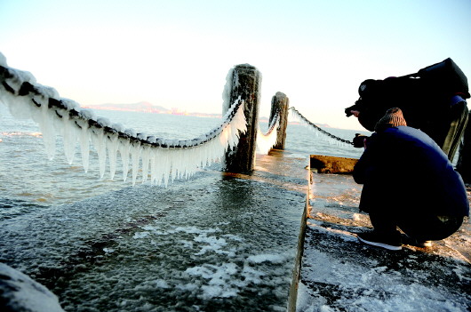 21日烟台海边,被大风卷起的浪花在护栏上结成了冰凌。 本报记者 赵金阳 摄