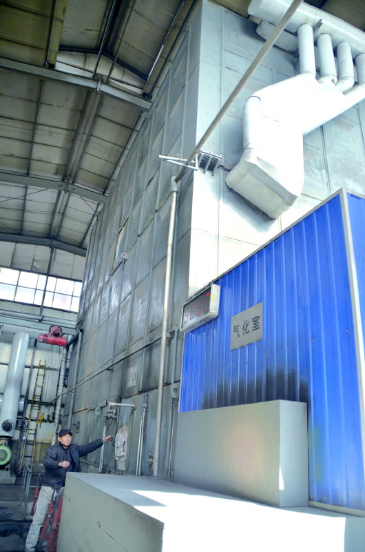 图为金丝达集团改造成功的无烟锅炉。煤炭通过蓝色的气化室气化后再燃烧,可以降低烟尘排放量。 本报记者 高寒 摄