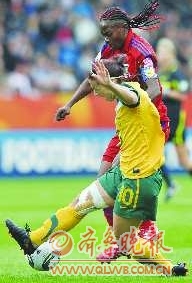 7月3日,赤道几内亚队球员阿农玛(上)与澳大利亚队球员塞尔韦特在比赛中拼抢。当日,在德国波鸿进行的2011年德国女足世界杯D组比赛中,澳大利亚队3:2险胜赤道几内亚队。 新华社记者 武巍 摄