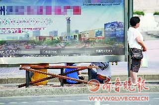 7月14日,湖滨大道一处公交车站候车凳损坏,市民或站着或坐在地上等车。
