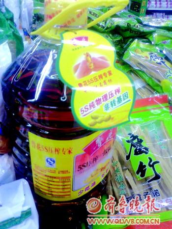 | 鲁花花生油外包装上“人民大会堂国宴用油”的字样被一层黄色的“创可贴”覆盖了。 孟敏 摄 |