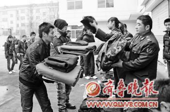 7日下午4时许,德城区人武部为将在10日第一批奔赴全国各地的67名新兵,发送衣服和日常用品。据了解,德城区2012年新兵共有340人,会分批在12月10日至14日从德州出发到达全国各大军区。 本报记者 常学艺 本报通讯员 许治中 张卫忠 摄影报道
