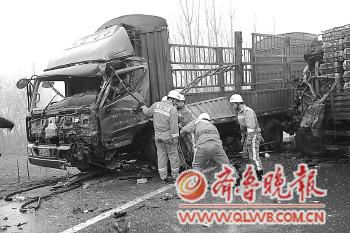 本报泰安12月7日讯(记者 刘来 通讯员 张洪振 时公泉) 7日上午,G205国道新泰市沈家庄段发生惊险一幕,两辆大货车迎头相撞后,一辆大货车又遭追尾,救援人员赶到现场救出两名被困司机。 7日7时59分,泰安市消防支队新泰中队接到报警,G205国道新泰市沈家庄段,三辆车连环相撞,有两名驾驶员被困。新泰中队救援人员赶到现场后发现,路上一片狼藉,玻璃洒落一地。经了解,一辆西行的绿色大货车与迎面驶过来的红色货车相撞后横在路中央,红色大货车又被后面的一辆小货车追尾。两大货车内各有一名驾驶员被困。小货车只是轻微刮擦,受损并不严重。 救援人员立刻救援被困司机,并疏散围观群众,警戒交通。红色大货车司机的左腿被驾驶室座椅卡住,无法动弹。指挥员命令救援队员用破拆工具打开驾驶室车门,并扩张驾驶室空间。随着空间扩大,救援人员救出了被困司机,由120救护车送往医院。随后,救援官兵又救出绿色大货车上的被困司机,等待在旁边的另一辆救护车送司机到医院救治。据了解,两名司机都无大碍。 据救援人员分析,当时下着小雨,出事路段附近正好是个拐弯处,不排除司机视线不佳可能。事故发生的具体原因在调查中。