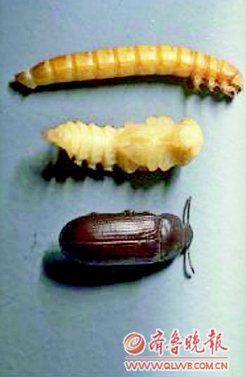 | 地里的烂白菜叶是黄粉虫最好的饲料。 本报记者 邵艺谋 摄 |  | 黄粉虫的幼虫、蛹和成虫 |  | 黄粉虫的幼虫、蛹和成虫 |  | 黄粉虫的幼虫、蛹和成虫 |