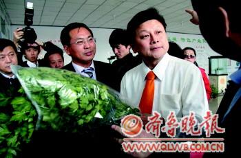| 30日下午,在潍坊峡山区王家庄街办有机蔬菜加工基地,台湾花莲县县长傅崐萁正在了解有机蔬菜的相关信息。 本报记者 吴凡 摄 |