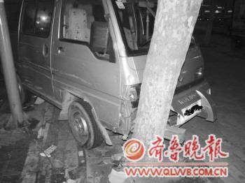 | ▲事故现场。 |  | ◥面包车连撞两车,撞在树上才停了下来。 本报通讯员 军良 摄 |