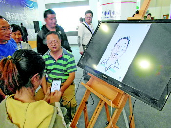 ◤在电子画板上描绘肖像画。信博会上,各种新技术令人大开眼界。 见习记者 张頔 摄
