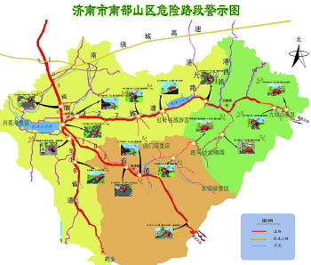 就在此处道路一侧,矗立着一幅“济南市南部山区危险路段警示图”。警示图上,标注出了重要的景区、道路、高速公路及河流水库等位置。最主要的是在警示图上,省道103、省道327及省道518附近路段标注出了包括8个急转弯、3个盘山(公)路、2个交叉路口、1个丁字路口、2个长坡在内的16个危险路口。