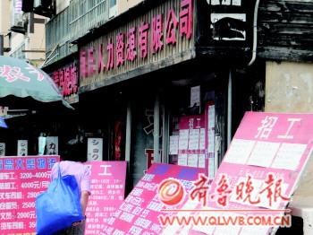 | 内蒙古路一家职介门口摆放的招聘信息。 本报记者 李晓闻 摄 |