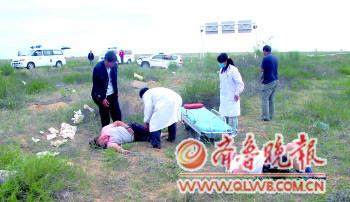 本版图片由伤者家属提供 |  | ◤医护人员正在事发现场救援伤者。 |  | ▼脊椎骨受伤的司机和爆胎后的汽车。 |