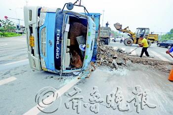 15日上午9点左右,世纪大道,一辆拉石子的货车在十字路口翻倒,石子撒落一地,轮胎周围流满了机油。幸运的是,司机并未受伤。据司机李先生介绍,之所以发生翻车事故,是因为车子左后车胎突然爆了,“没办法,我只能往右边打方向,拉的石子又重,控制不住就翻车了”。 本报记者 张泰来 左庆 摄影报道