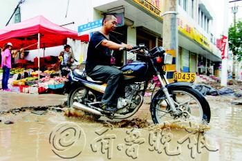 由于张店区西二路整修,与其相交的城中西内环路因西二路翻新多处出现地坑,严重影响行人、车辆行驶。特别是近日淄博连续降雨,出行市民只能涉水而过。上午11时,市政部门已经进行简单填埋,确保道路畅通,城中西内环路与西二路相交处地坑将与西二路统一进行修理。