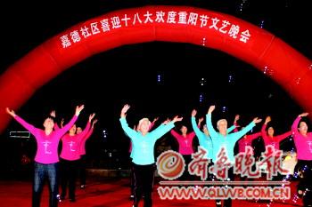 22日,嘉德社区举办了一场“喜迎十八大 欢度重阳”的文艺晚会。健身舞、京剧、太极拳、养生操……老年人们在节目中展现了健康乐观的精神风貌。