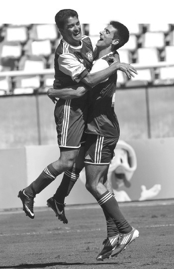 11月18日,德约科维奇(右)在进球后与前巴西球星贝贝托庆祝。当日,塞尔维亚网球选手德约科维奇参加了在巴西里约热内卢举行的一场足球慈善赛,展示了他的足球技艺。