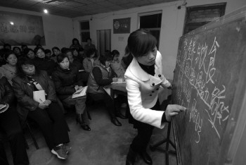 18日,在奎文区大虞街道红旗社区,潍坊市家政职业培训老师在教授居民母婴护理知识。为增强社区妇女工作技能,该社区开展了为期三天的母婴护理员技能培训班。