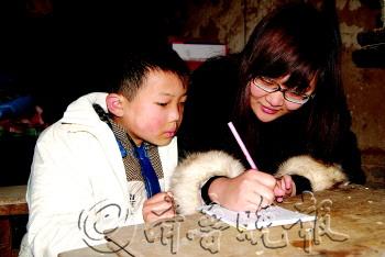 | 众乡邻向捐款箱投入一片爱心。 |  | 热心大学生刘昱杉给小宗磊作辅导。 本报通讯员 魏忠友 摄 |