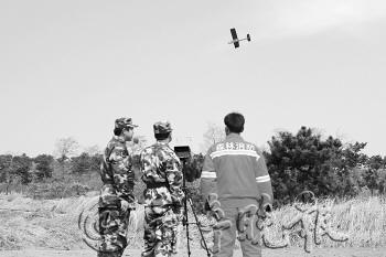 针对山林防火,威海市边防支队初村边防派出所利用遥控模型飞机携带高清摄像头在空中进行监控,空中拍摄的清晰画面被实时显示在地面监控器上。一旦发现起火点,模型飞机可以对人员难以进入、难以观察到的区域,以及火势的大小转变,进行全方位航拍,为防火指挥部提供直观的影像。图为工作人员操作遥控模型飞机。