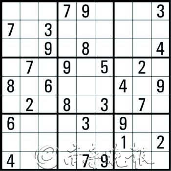 在每个小格子里填上1至9中的数字,使得每行、每列、每个3×3的粗线围成的宫内每个数字各出现一次。