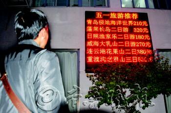 | ◤一市民正在看一旅行社推出的“五一旅游”项目。