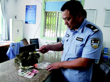 民警从包中翻出作案工具和部分赃物。 记者 侯艳艳 摄