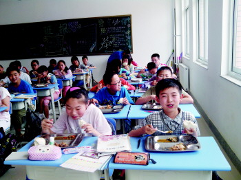 吃免费午餐的学生有说有笑。 记者 刘清源 摄