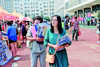 26日,在高考招生填报志愿咨询会上,各高校打起了宣传大战。各个学校工作人员不限量地向考生及家长分发学校招考材料。图为一对参加高招会的母女抱着成捆成捆的招生材料,准备回家整理材料,找寻适合自己的高校。