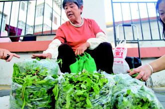 ▲26日,在建设西街,一位市民在出售野菜。 记者 王震 摄