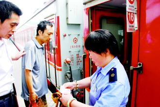 经过检票,王琪(中)踏上了回家的列车。 本报记者 赵艳虹 摄