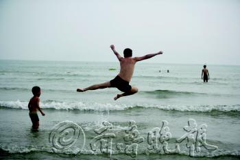 | 6月30日,在一浴,一对父子在海边消暑。 张晓鹏 摄 |