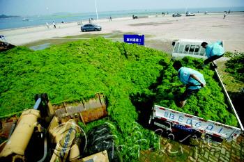 | 在六浴,推土机在清理浒苔。 |  | 在八大峡广场,工作人员正在卸载浒苔。 |  | 工作人员对浒苔进行打包。 |