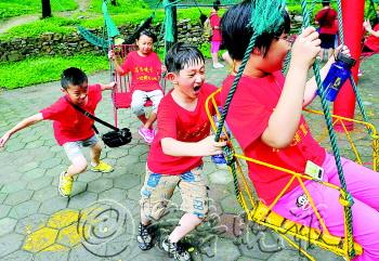 | 小记者们在淄博原山森林公园游乐园开心玩耍。 本报记者 邱志强 摄