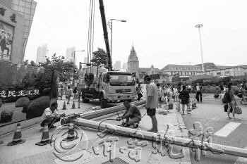 10日,在费县路与郯城路路口,工人正在拆卸一处路灯。据现场工人介绍,此处将要划入地铁施工区域,所以要将区域内的路灯进行拆除,为地铁施工“清道”。