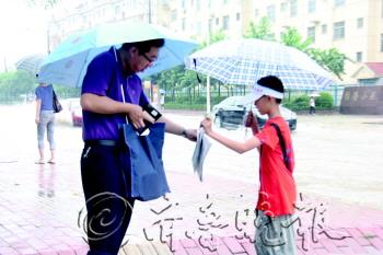 | 大雨中小记者向在公交站牌等车的市民销售报纸。 本报记者 张牟幸子 摄 |