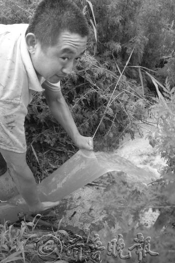 | 11日,商河菜农付兆亮将自家蔬菜大棚里的积水引到排水沟,排水工作已经进行了一天一夜。 本报记者 陈文进 摄 |