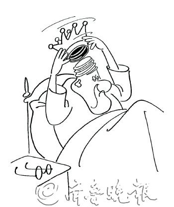 郑辛遥 滚滚红尘,世事沉浮。 在这纷纷扰扰的人生竞技场上,皇冠曾是多少人的梦想。拥有它尽可享荣华富贵,扬千秋之名。然而—— 芸芸众生,君王几何? 于是乎,斗争、血腥就成了王位的舞者。皇冠戴在头上,危险萦绕身边,看似不可一世的君王,却终日—— 惴惴不安,时时提防。 只有夜幕降临,红尘散去,众生歇息,君王方敢弹去疲顿,还原自我,亮出天机。不过,好端端的头颅,却留下了永远也抹不去的压痕。 此图运用特有的漫画语言,以“拧紧”和“怕丢”的联想,寥寥几笔,就形象而诙谐地把君王怕丢皇冠的心态表现得栩栩如生、入木三分。(王雪巍)