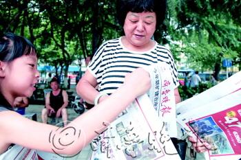 小记者在向市民推销报纸。实习生 丁明寒 摄