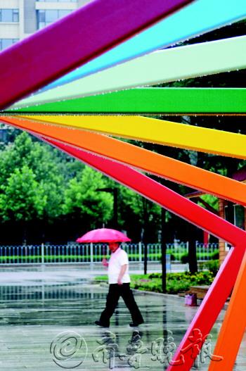 连续多日的降雨使城市变得清新自然,不少户外建筑的色彩经过冲刷后也愈加鲜艳。图为,7月11日,一市民在长河公园彩色雕塑前经过。 本报记者 马志勇 摄
