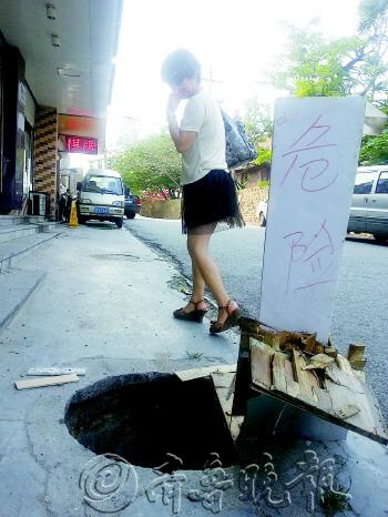 本报8月6日讯(记者 侯艳艳) 芝罘区三马路一个井盖陷落,一个月时间里连坑人和车。附近市民打了20多个电话仍没有找到产权单位,无奈之下只好拨打本报热线求助。 6日下午,记者按照市民的指引来到三马路东头,远远地就看到路边竖着一个简易警示牌,牌上大大地写着“危险”俩字。记者走近一看,井盖掉进了井里,井里不时飘起一股股臭气。 旁边一家蛋糕店的工作人员林女士介绍,井盖掉进去一个月了。他们在井上放了块木板,但被车轧坏了,后来做了块警示牌竖在边上。 尽管蛋糕店的工作人员为无盖井费了不少心思,一个月时间里还是有多辆轿车的车轮陷进井内。更危险的是,前两天还有一个小伙子险些整个人掉到井内,当时他的一条腿迈进井里,受了伤。 蛋糕店的工作人员说,眼看着这口井坑了车又伤人,他们心里也很着急。由于不知道井盖属于哪个单位负责,他们先后查询了供水、供电、养管处、排水处等多个部门,但都回复不是井盖的产权单位。“一个月时间,我们打了不下20个电话,现在实在不知道这口井归谁负责了。”林女士说。 记者随后联系了烟台市排水处,养护管理所设施管理科科长项先玉得知情况后第一时间赶到现场查看了情况。他介绍,这口井属于化粪池检查井,归附近的民生物业管理公司负责,他随后联系了民生物业管理公司前来处理。 市政养管处的工作人员介绍,市民发现问题井盖可及时拨打养管处设施科热线6244294反映或咨询产权单位。一旦接到窨井盖丢失举报,养管处工作人员半小时内会赶赴现场查看,并迅速向有关产权单位发出补盖、修缮指令。