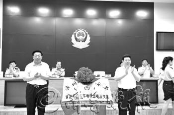 | 市委常委、政法委书记胡炳山(左)和副市长张兆宏为市公安局食品药品与环境犯罪侦查支队揭牌。 本报记者 王忠才 摄 |