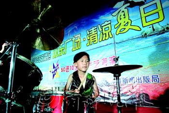 图为,梦想star小选手在台上进行架子鼓表演。