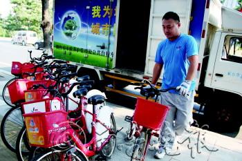 | 市政养管处公共自行车管理中心工作人员在对公共自行车进行例行调度。 本报记者 韩逸 摄 |