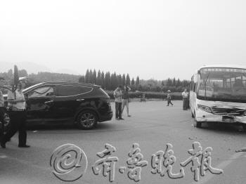 本报9月2日讯(记者 彭彦伟) 2日下午3点左右,在日照市北京路与临沂路交汇处秦楼街道若家村附近,一辆日照跑五莲山的旅游客车与一辆越野车相撞,旅游客车上有三十余人,事故共造成6人受伤。 据目击者介绍,当时旅游客车由南向北走,越野车从临沂路上行驶过来后往北拐,两车在路口处躲闪不及相撞。“当时声音非常大,撞碎的零件都飞出去很远。”该目击者说。 旅游客车司机介绍,当时客车上有30多个人,“已经尽量避免相撞了,但实在躲闪不开了。”该司机说。据了解,越野车上总共有5个人,其中还有一个1岁大的小孩。事故共造成6人受伤,目前正在接受治疗。现场负责处理事故的民警介绍,事故原因正在进一步调查中。