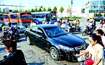 3日早上,在经十纬十二路口,交警拦住一辆右转轿车,该车在斑马线亮绿灯后依然抢行,不主动避让过马路的行人。当天,共有3名驾驶员因为不礼让行人受到处罚。 本报记者 王媛 摄